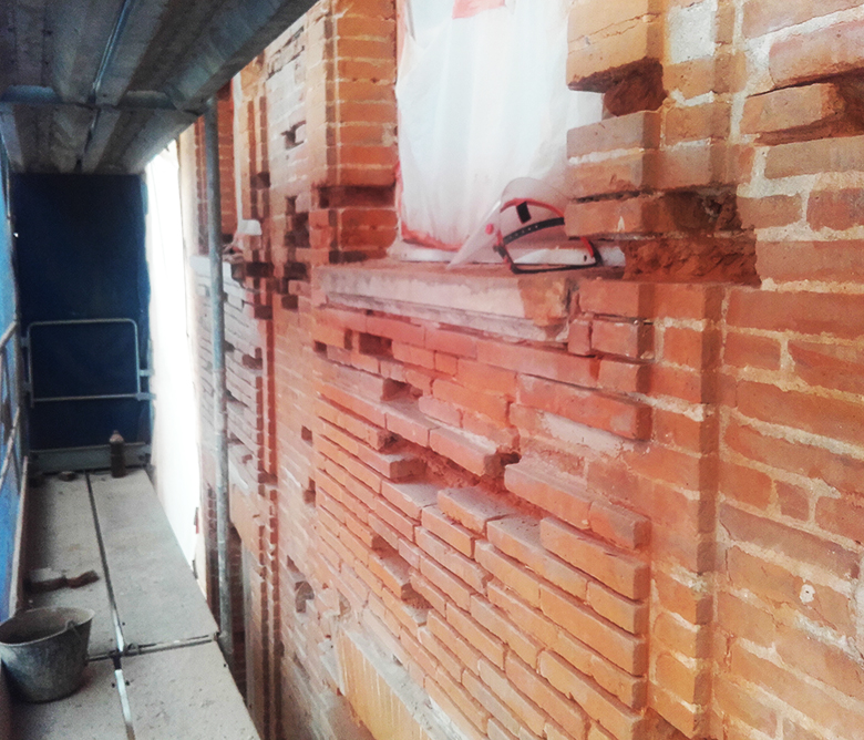 Ce type de façade présente souvent des problèmes de briques abimées. De par leur qualité plus ou moins bonnes certaine briques subissent le gel et finissent par ce détériorée. Le travail consiste à les remplacée dans la masse « en tiroir ».